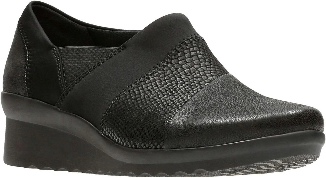 Englin’s Fine Footwear presents the women’s ‘Caddell Denali’ from Clarks. This style brings modern style to new levels of comfort. The streamlined design of its upper showcases a vibrant snake print, and its wedge heel provides a subtle height boost without adding a challenge. As a Cloudsteppersâ„¢ style it benefits from Clarks Cushion Softâ„¢ padding and a breathable, moisture-wicking OrthoLite® footbed.